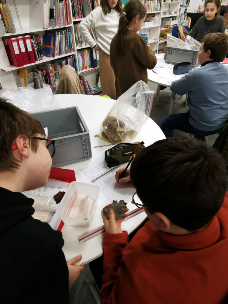 La première séance, dédiée à une initiation à l’archéologie, a permis aux élèves de découvrir les principes de la fouille, les métiers de l’archéologie et les méthodes de travail grâce à un diaporama et à une mallette pédagogique favorisant échanges et manipulations.